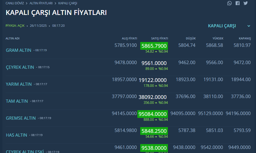 KAPALIÇARŞI ALTIN FİYATLARI