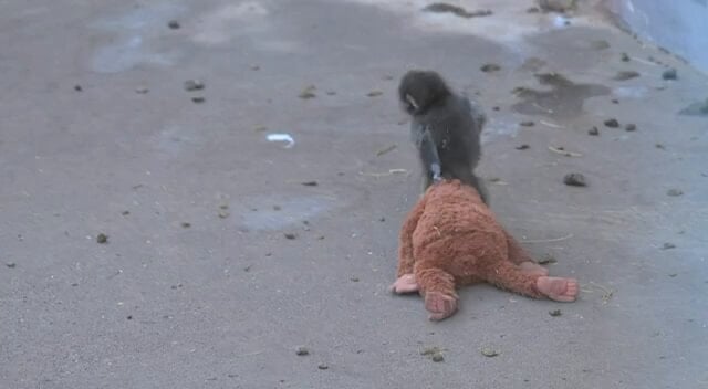 Yavru maymunun, yanından ayırmadığı pelüş oyuncağıyla görüntüleri internette büyük ilgi gördü.