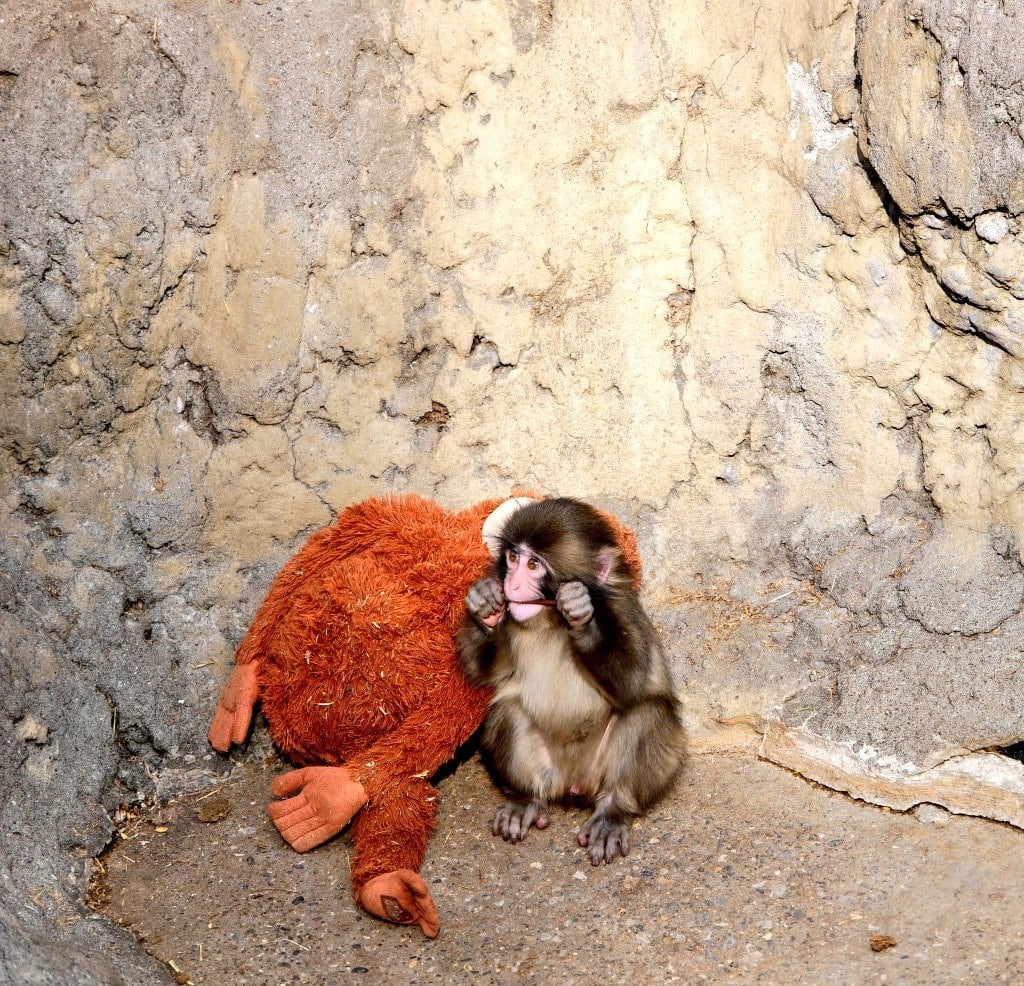 Yavru maymunun sağlıklı gelişimi için yoğun çaba harcayan Bakıcılar, 'Punch'ın yalnızlık hissini azaltmak ve psikolojik olarak desteklemek amacıyla ona pelüş bir maymun verdi.