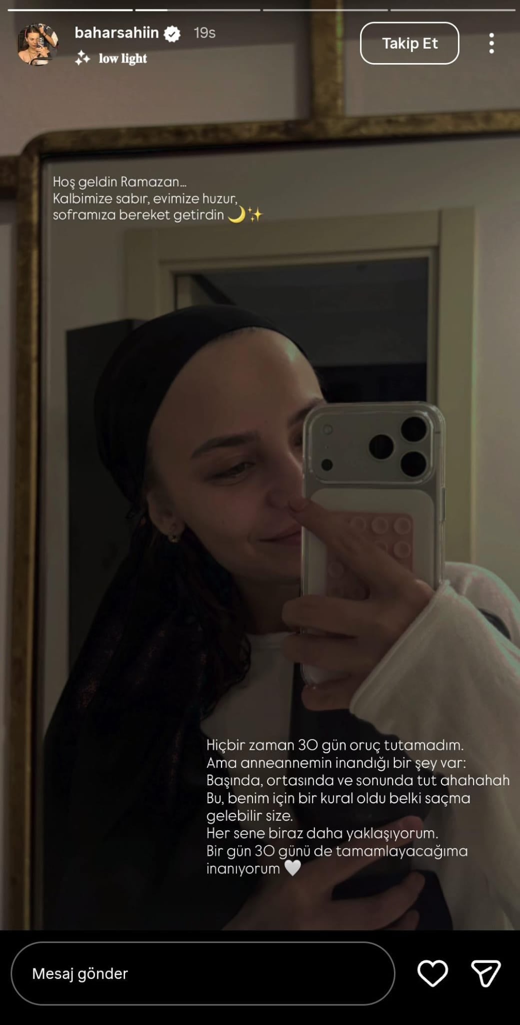 Başörtülü bir fotoğrafını takipçilerinin beğenisine sunan Şahin, oruç ibadetiyle ilgili samimi açıklamalarda bulunarak bir aile geleneğini dile getirdi.