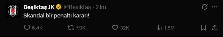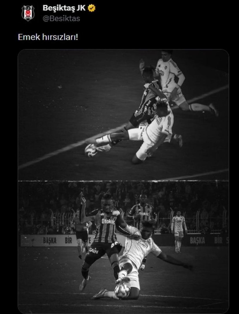 Beşiktaş'tan yapılan kısa açıklamada, "Skandal bir penaltı kararı!" ifadesine yer verildi. Siyah beyazlılar daha sonra pozisyon anını koyarak "Emek hırsızları" paylaşımı yaptı.