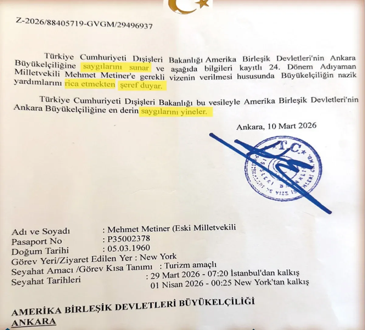 Metiner, Bakanlığın mektubunu rağmen ABD'nin, vize başvurusunu reddettiğini önceki gün duyurmuştu. Yaşanan bu gelişmeyi CHP Grup Başkanvekili Murat Emir eleştirdi.