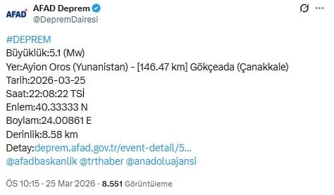 Afet ve Acil Durum Yönetimi Başkanlığı (AFAD) Yunanistan'da Ayion Oros'ta, Gökçeada'ya 146.47 kilometre açıklarında 5.1 büyüklüğünde bir deprem olduğunu duyurdu.