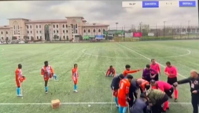 1-1 eşitlikle devam eden müsabakanın 17. dakikasında mola verildiği esnada hakemlere su ikram eden konuk takımın antrenörü Mustafa Bebe, bir anda yere yığıldı.