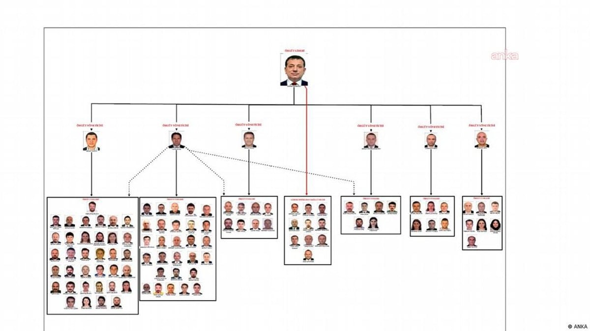 İddianamede İmamoğlu “Örgüt lideri” olmakla suçlanıyor. Bir şemanın da yer aldığı iddianamede 969 kez “Hatırladığım kadarıyla”, 691 kez “-mışlar, mişler, muşlar”, 546 kez “Duydum”, 516 kez “Bildiğim kadarıyla”, 499 kez “Olabilir”, 401 kez “Öğrendim”, 347 kez “Söylemişti”, 235 kez “Düşünüyorum” geçiyor, 15 gizli tanık var.