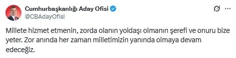 "Millete hizmet etmenin, zorda olanın yoldaşı olmanın şerefi ve onuru bize yeter. Zor anında her zaman milletimizin yanında olmaya devam edeceğiz."