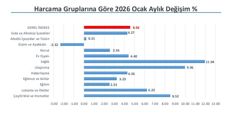 2026 Ocak ayında en yüksek grup artışı Sağlık harcamaları grubunda (% 11,94), en yüksek grup azalışı ise Giyim ve Ayakkabı Harcamaları grubunda (-2,32) izlenmiştir. o Harcama grupları itibariyle değişim oranlarına aşağıdaki tablolarda yer verildi.