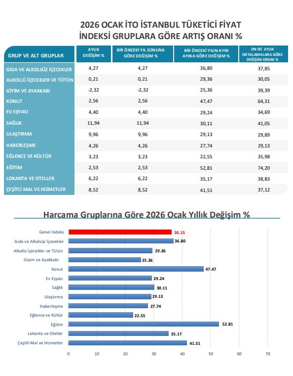 Son dakika... İstanbul Ticaret Odası 2026 Ocak ayı enflasyon rakamlarını açıkladı. Buna göre ocak ayında İstanbul'un enflasyonu aylık artışı yüzde 4,56 olurken, yıllık bazda yüzde 36,15 oldu.