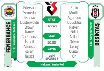 Fenerbahçe, kazanıp Trabzon’la birlikte Galatasaray’ın ensesine yapışmak istiyor. Beşiktaş da galip gelerek dengeleri bozmayı hedefliyor. Aksi takdirde Kartal, mağlup olursa yarışa havlu atabilir. Dev derbide ezeli rakipler bu sezon 3. kez karşı karşıya gelecek. Beşiktaş’ta oynanan ilk kapışmada Kartal, 2-0 önde iken Orkun Kökçü’nün kırmızı kart görmesinin ardından 3 gol yiyip Fener’e 3-2 yenildi. Kupada da Kadıköy’de Cerny, yıldızlaşmış ve Kartal, 2-1 kazanmıştı.