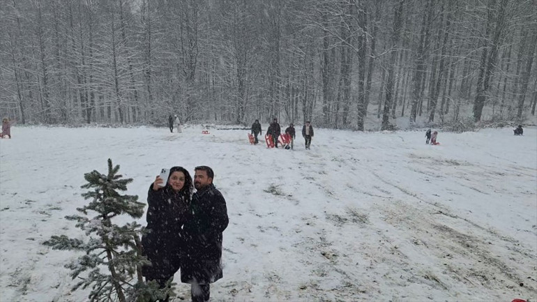 Yağışın ardından ormanlar beyaza bürünürken hafta sonu tatilini fırsat bilenler bölgeye giderek vakit geçirdi.
