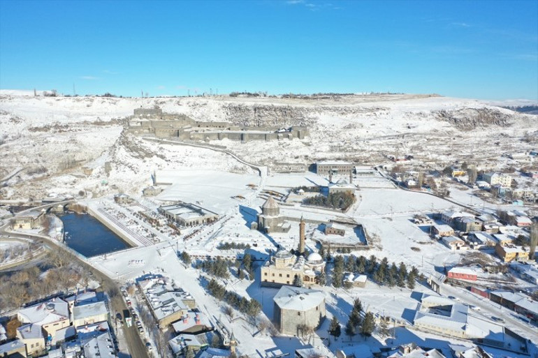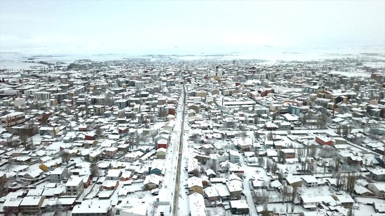 Kar yağışıyla beyaza bürünen Ağrı kent merkezi ve çevresindeki dağlar dronla görüntülendi.