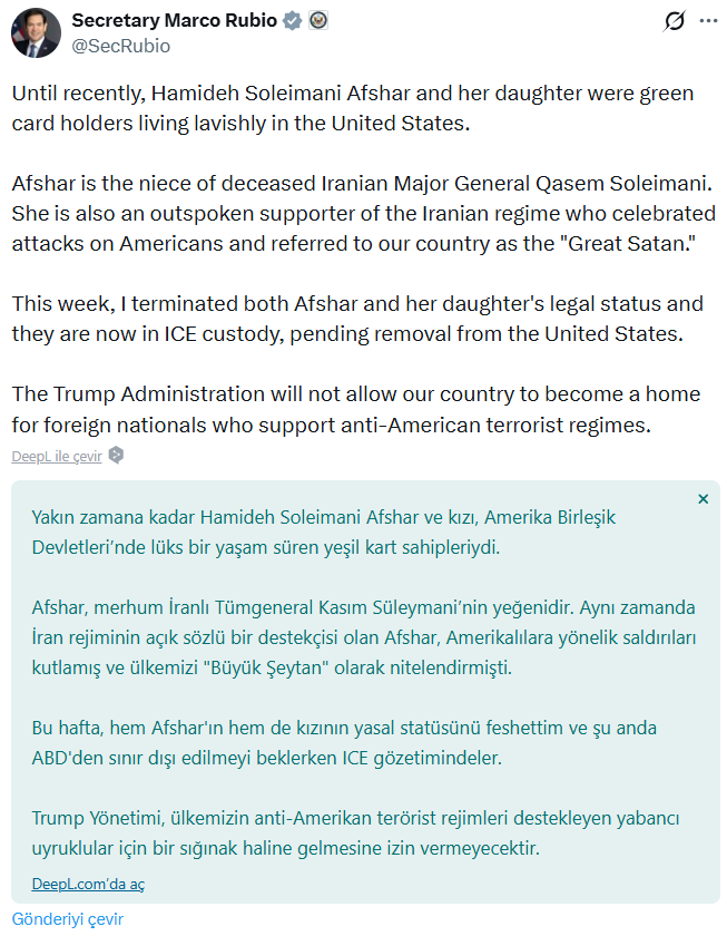 Rubio, Afshar ve kızının ABD'deki Green Card statülerinin iptal edildiği ve ABD Göçmenlik ve Gümrük Muhafaza (ICE) ekipleri gözetiminde olduklarını bildirildi.