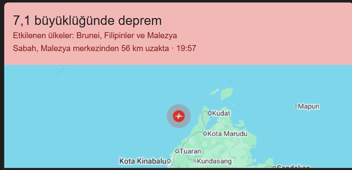 Avrupa Akdeniz Sismoloji Merkezi'nin (EMSC) açıklamasına göre Malezya açıklarında 7.1 büyüklüğünde deprem meydana geldi.