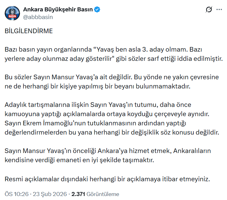 Ankara Büyükşehir Belediyesi (ABB) tarafından Mansur Yavaş'ın "Ben asla 3'üncü aday olmam. Bazı yerlere aday olunmaz aday gösterilir" ifadelerini kullandığına dair haberlere ilişkin açıklama yapıldı.