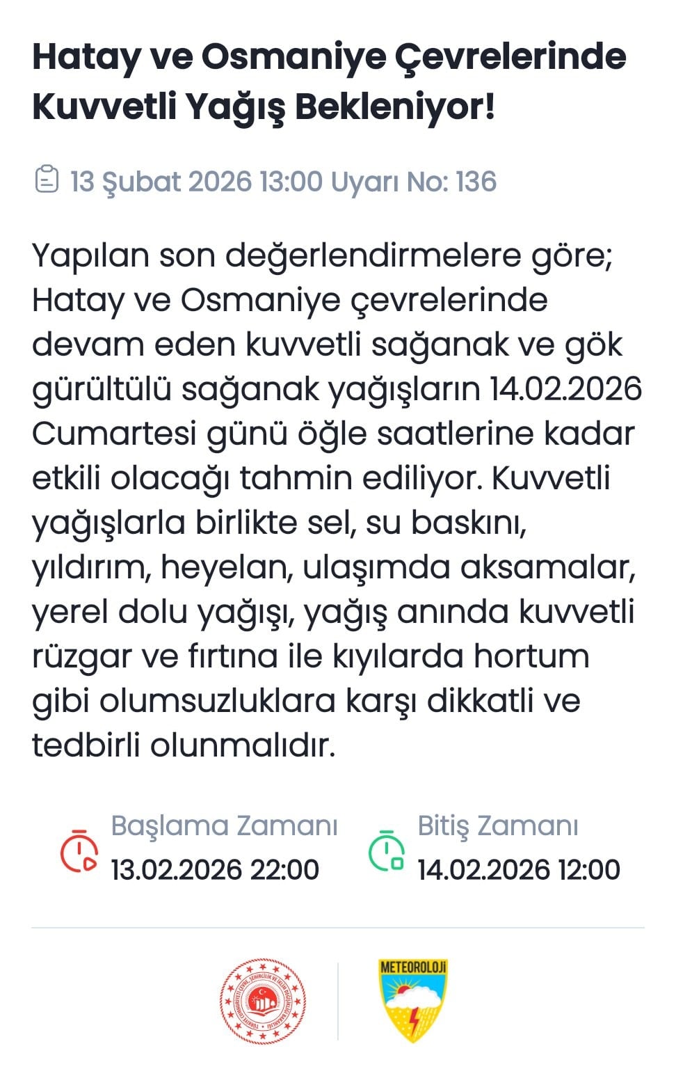 Yapılan uyarıda sağanak yağışa karşı tedbirli olunması istendi.