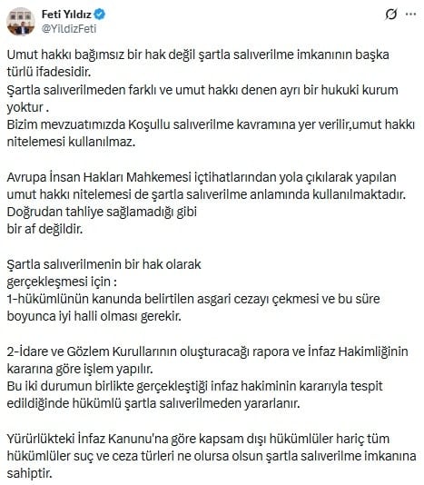 "Umut hakkı bağımsız bir hak değil şartla salıverilme imkanının başka türlü ifadesidir. Şartla salıverilmeden farklı ve umut hakkı denen ayrı bir hukuki kurum yoktur. Bizim mevzuatımızda Koşullu salıverilme kavramına yer verilir,umut hakkı nitelemesi kullanılmaz.