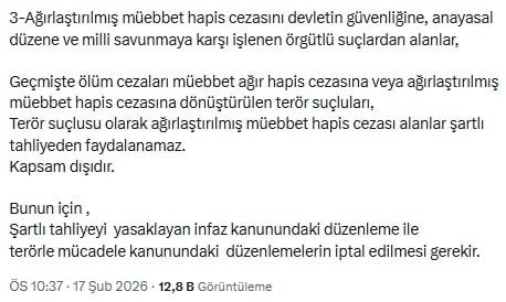 Bunun için, Şartlı tahliyeyi yasaklayan infaz kanunundaki düzenleme ile terörle mücadele kanunundaki düzenlemelerin iptal edilmesi gerekir."