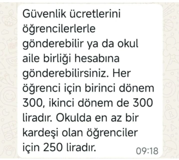 Okul aile birlikleri aracılığıyla gönderilen mesajlarda, güvenlik personeli istihdamı için "katkı payı" istenirken, uygulanan "kardeş indirimi" tarifesi dikkat çekti.