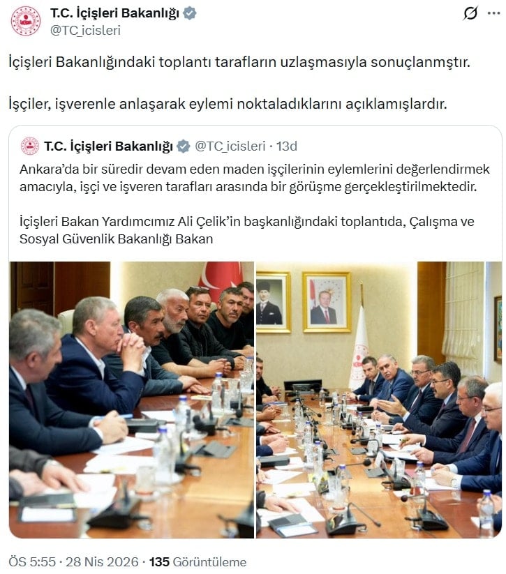 Ankara’da bir süredir devam eden maden işçilerinin eylemlerini değerlendirmek amacıyla, işçi ve işveren tarafları arasında bir görüşme gerçekleştirilmektedir. İçişleri Bakan Yardımcımız Ali Çelik’in başkanlığındaki toplantıda, Çalışma ve Sosyal Güvenlik Bakanlığı Bakan Yardımcısı Faruk Özçelik, Enerji ve Tabii Kaynaklar Bakan Yardımcısı Abdullah Tancan, Emniyet Genel Müdürü Mahmut Demirtaş, Çalışma ve Sosyal Güvenlik Bakanlığı Çalışma Genel Müdür Vekili Oğuz Tuncay, Rehberlik ve Teftiş Başkan Vekili Erol Güner, Ankara Vali Yardımcısı Gürsoy Osman Bilgin, Ankara Emniyet Müdürü Engin Dinç, Emniyet Güvenlik Daire Başkanı Emrullah Gölcük, Bağımsız Maden-İş Sendikası Başkanı Gökay Çakır, Yıldızlar SSS Holding CEO’su Ali Vahit Atıcı, Sendika yetkilisi Başaran Aksu, maden işçisi Sinan Koçak, maden işçisi Özcan Gültekin ve Doruk Madencilik Şirketi sahibi Sabahattin Yıldız yer almaktadır. Saat 16:00’da başlayan toplantıda devam eden grev ve eylemleri sona erdirmek üzere uzlaşma zemini üzerinde görüşmeler devam etmektedir.