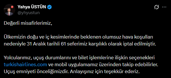 Türk Hava Yolları (THY) İletişim Başkanı Yahya Üstün, sosyal medya hesabından yaptığı açıklamasında 31 Aralık tarihinde yapılması planlanan 61 seferin iptal edildiğini duyurdu.