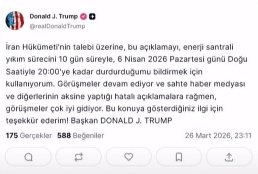 "İran Hükümeti'nin talebi üzerine, bu açıklamayı, enerji santrali yıkım sürecini 10 gün süreyle, 6 Nisan 2026 Pazartesi günü Doğu Saatiyle 20.00'ye kadar durdurduğumu bildirmek için kullanıyorum. Görüşmeler devam ediyor ve sahte haber medyası ve diğerlerinin aksine yaptığı hatalı açıklamalara rağmen, görüşmeler çok iyi gidiyor."