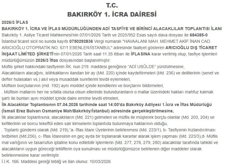 "Bakırköy 1. Asliye Ticaret Mahkemesi'nin 07/01/2026 Tarih ve 2025/952 Esas sayılı dava dosyası ile 684385-0 İstanbul ticaret sicil no sunda kayıtlı 0750292836 Vergi numaralı "HAVAALANI MAH. MEHMET AKİF İNAN CAD. ARICIOĞLU OTOPRATİK NO: 67/1 ESENLER/İSTANBUL" adresinde faaliyet gösteren ARICIOĞLU DIŞ TİCARET İNŞAAT LİMİTED ŞİRKETİ'nin 07/01/2026 Tarih saat 11.35 itibarı ile İFLASINA karar verilmiş olup, tasfiye işlemleri müdürlüğümüzün 2026/3 İflas dosyasından başlanılmıştır."