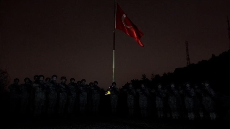 Paylaşımda, görev başındaki Mehmetçiğin depremin gerçekleştiği dakikalarda Türk bayrağının altında saygı duruşunda bulunduğu görüntülere de yer verildi.