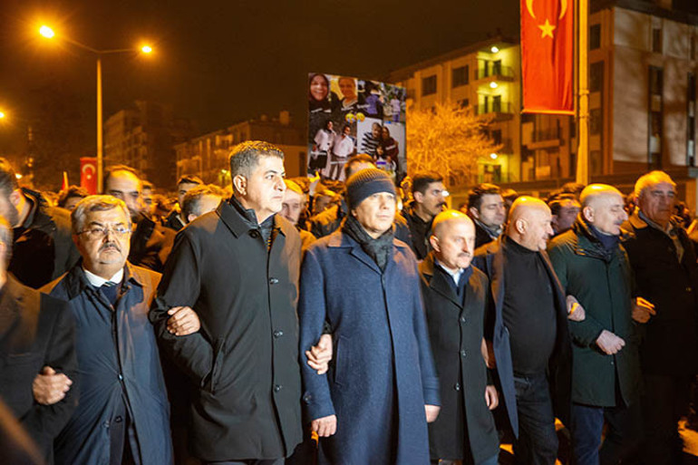 Bakan Yerlikaya, Vali Osman Varol, AFAD Başkanı Ali Hamza Pehlivan, Çalışma ve Sosyal Güvenlik Bakan Yardımcısı Ahmet Aydın, TBMM Bayındırlık, İmar, Ulaştırma ve Turizm Komisyonu Başkanı Adil Karaismailoğlu'nun da katılımıyla Valilik önünde bir araya gelenler, kentin simgesi olan ve aradan geçen üç yıla rağmen 04.17'yi gösteren saat kulesine kadar kol kola girerek yürüdü.