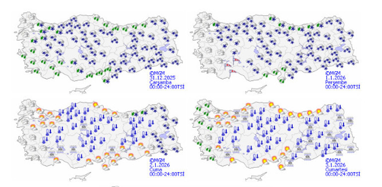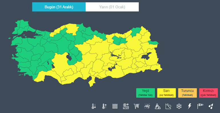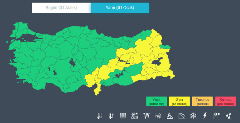 Meteoroloji Genel Müdürlüğü, yurt genelinde etkisini artırması beklenen olumsuz hava koşulları nedeniyle 31 Aralık tarihi için 42 il 1 Ocak Perşembe günü için 21 ilde için sarı kodlu uyarı verdi. Yapılan değerlendirmelere göre kuvvetli yağış, kar, buzlanma ve yer yer ulaşımda aksamalara yol açabilecek hava olaylarına karşı vatandaşların dikkatli ve tedbirli olması istendi. Yetkililer, özellikle yüksek kesimlerde riskin arttığına dikkat çekti.