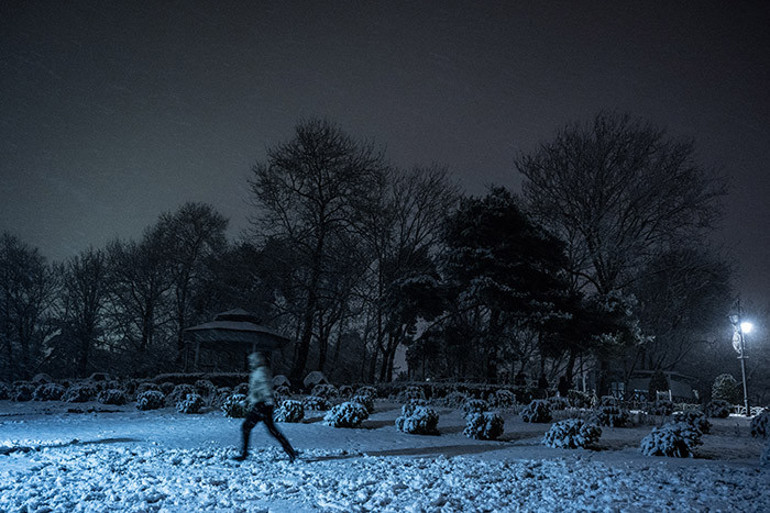 Başakşehir, Arnavutköy ve Beylikdüzü'nde de zaman zaman şiddetini artıran kar yağışı nedeniyle yeşil alanlarda beyaz kar örtüsü oluşmaya başladı.