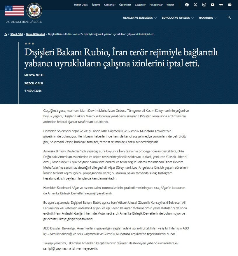 Rubio’nun kararıyla yeşil kart statüleri sona eren çiftin, ABD’nin ulusal güvenlik politikaları çerçevesinde değerlendirmeye alındığı ifade edildi.