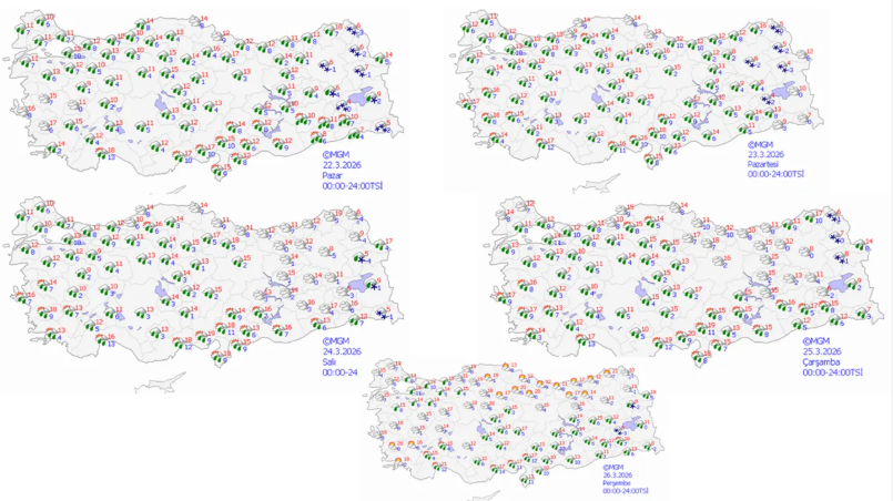 Hava sıcaklığının yurdun batı kesimlerinde 3 ila 5 derece artacağı, diğer bölgelerde ise önemli bir değişiklik olmayacağı tahmin ediliyor. 5 günlük hava tahmin raporuna göre, yağmur ve soğuk havanın perşembe gününe kadar etkisini yitirmeyeceği, genel tablonun ise 7 gün boyunca yağışlı kalacağı bildirildi.
