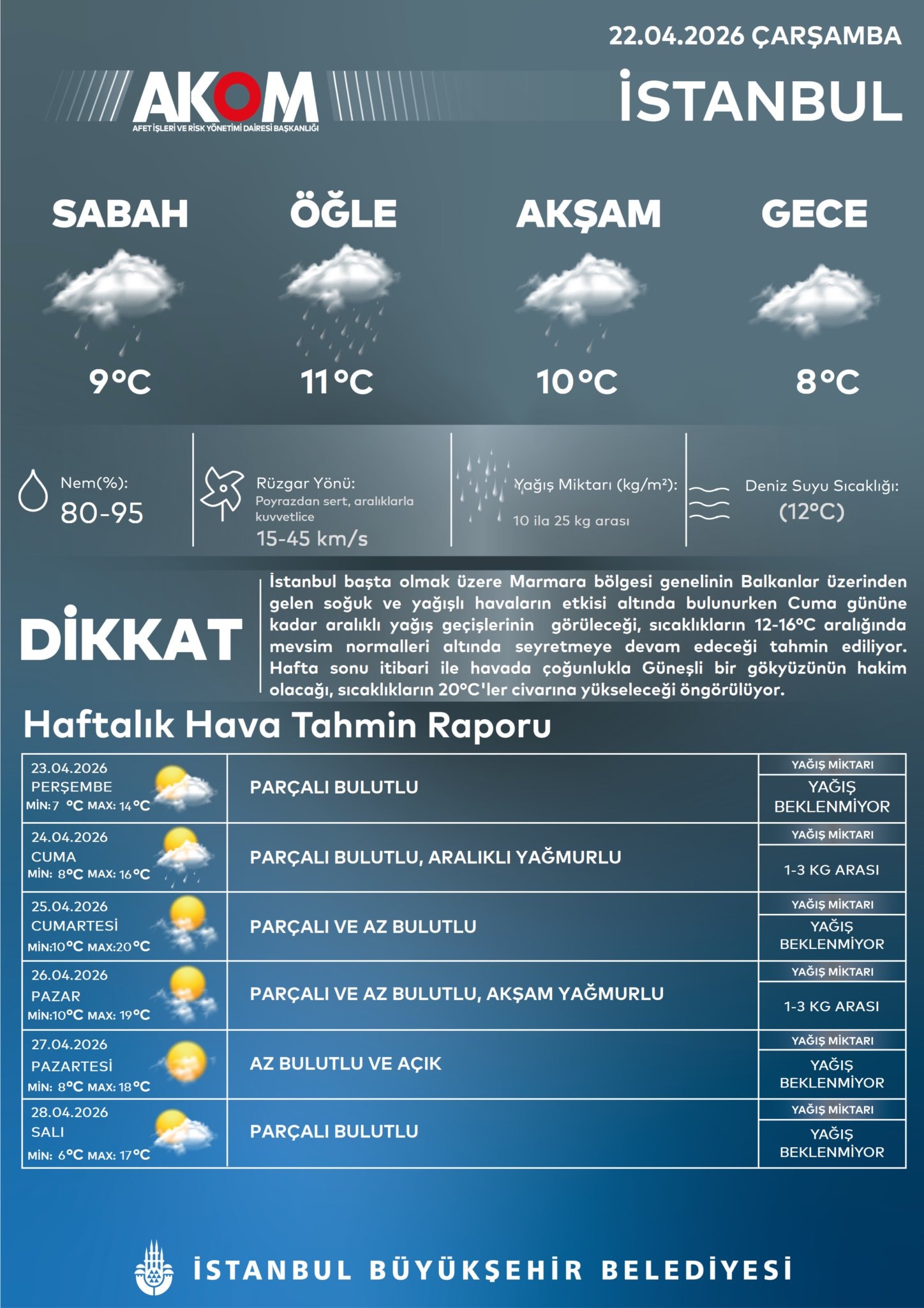 İstanbul'da sabah saatlerinde başlayan yağmurun öğlen 12.00'den sonra şiddetini daha da artırması bekleniyor. Gelişmeler üzerine sosyal medya hesabından İstanbullulara seslenen Valilik, yağışın perşembe günü öğle saatlerinden sonra etkisini kaybetmesinin beklendiğini duyurdu. Yapılan resmi açıklamada vatandaşların sel, su baskını, yağış anında ortaya çıkabilecek kuvvetli rüzgar ve ulaşımda yaşanabilecek aksamalara karşı azami ölçüde dikkatli ve tedbirli olmaları istendi. Gök gürültülü sağanak yağışların perşembe günü itibarıyla Marmara Bölgesi'ni tamamen terk etmesi öngörülüyor.