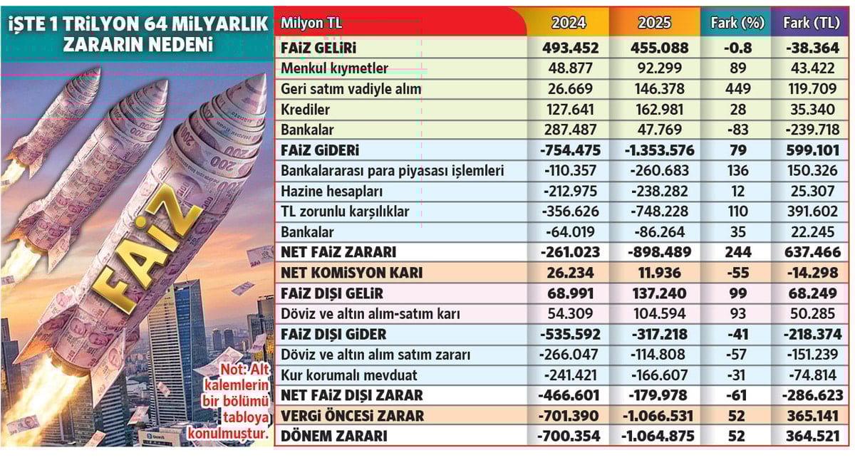Enflasyonu aşağı çekemediği için ülkeyi yüksek faize mahkum eden Merkez Bankası (TCMB), Kur Korumalı Mevduat’tan (KKM) sonra bir ağır darbeyi de faizden aldı. SÖZCÜ’nün ulaştığı bilgilere göre, 2025 yılını 1 trilyon 65 milyar liralık rekor zararla kapatan Merkez Bankası, bu zararın 898.5 milyar lirasını faiz ödemeleri yüzünden yaşadı.