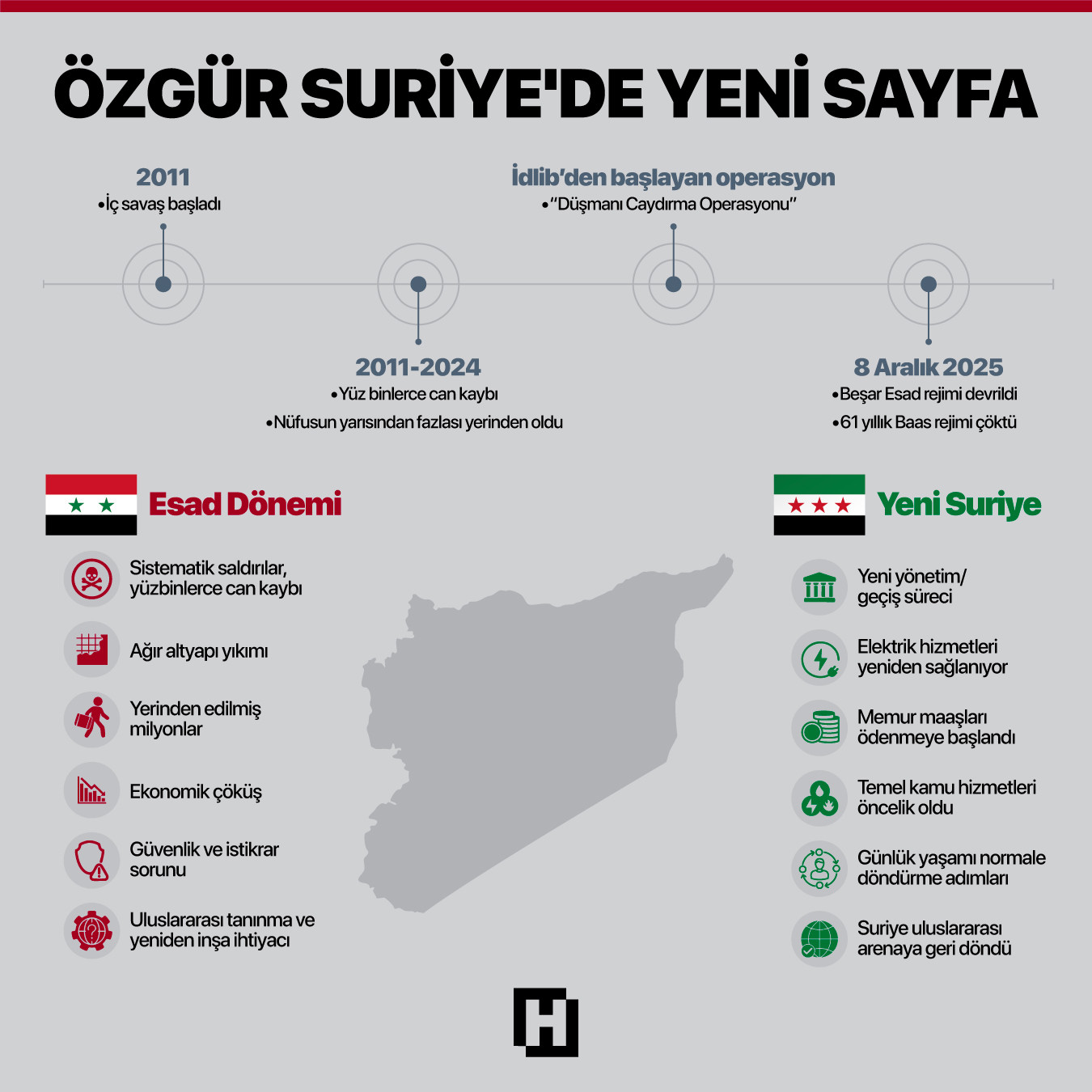 Suriye'de İdlib’den başlayan ve dalga dalga yayılan "Düşmanı Caydırma Operasyonu", Esad yönetiminin devrilmesi ve 61 yıllık Baas rejiminin çökmesiyle sonuçlandı. Rejimin saldırıları Suriye halkında kapanması zor yaralar bırakırken, 8 Aralık'taki devrimle ülkede yeni bir sayfa açıldı.