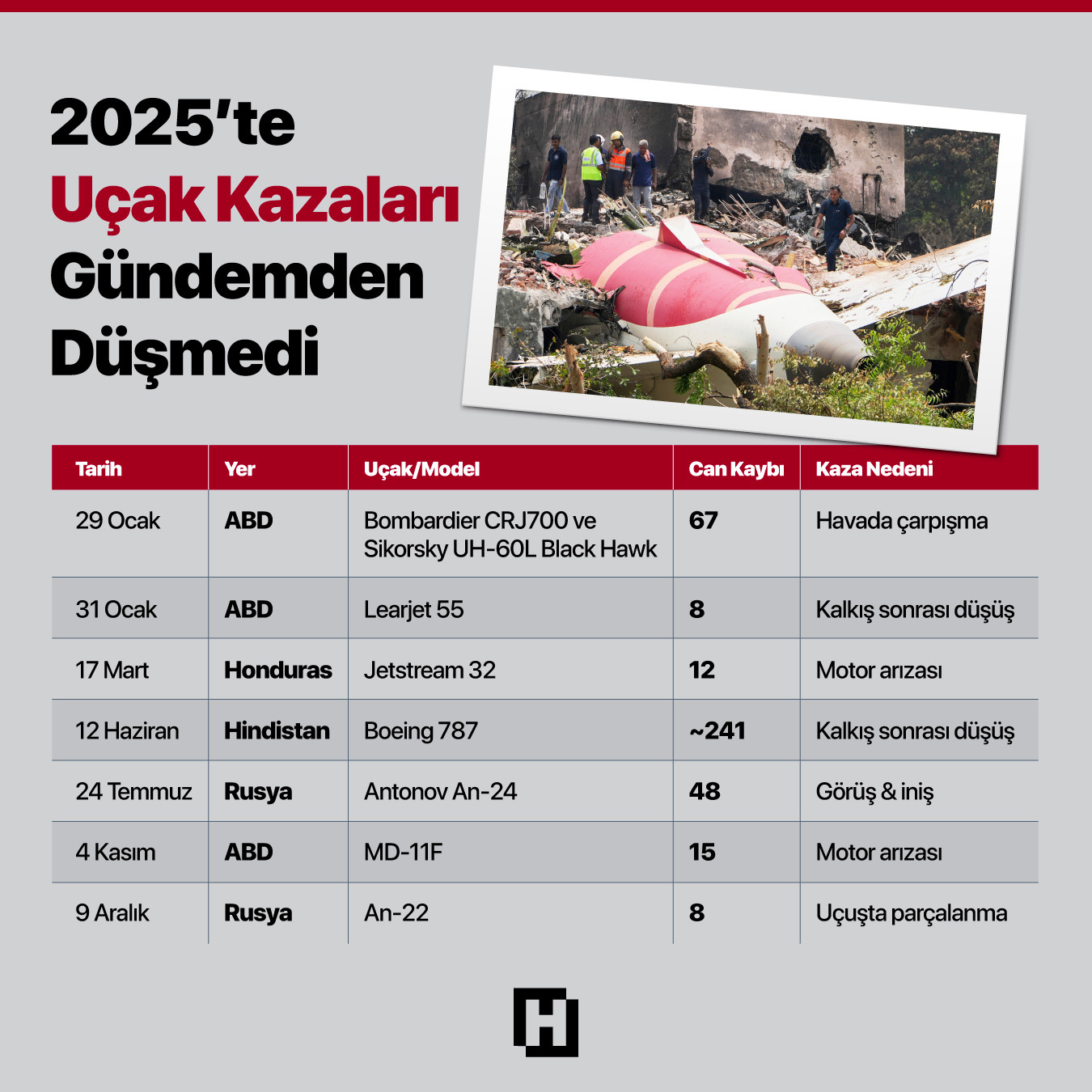 Haziran ayında Hindistan’da yaşanan uçak kazası, uluslararası sivil havacılık tarihinin en ölümcül kazalarından biri oldu. Air India’nın AI171 sefer sayılı Boeing 787-8 Dreamliner uçağı, Ahmedabad’dan Londra’ya gitmek üzere havalandıktan kısa süre sonra düştü ve uçağın enkazı bir tıp okulunun yurdu binasına çarptı. Kazada uçaktaki 230 yolcu ve 12 mürettebattan 241 kişi hayatını kaybetti, yere düşüş sırasında enkaz bölgesinde bulunan 19 kişi de yaşamını yitirdi. Kazanın ardından yürütülen kurtarma çalışmalarında, sadece bir kişi sağ olarak kurtarıldı. Yetkililer, 11A koltuğunda oturan Vishwash Kumar Ramesh'in kazadan sağ kurtulmasını "mucize" diye tanımladı. Ramesh, kazanın hemen ardından uçağın enkazında bir açıklık bulduğunu ve buradan çıkarak kurtulduğunu söyledi.