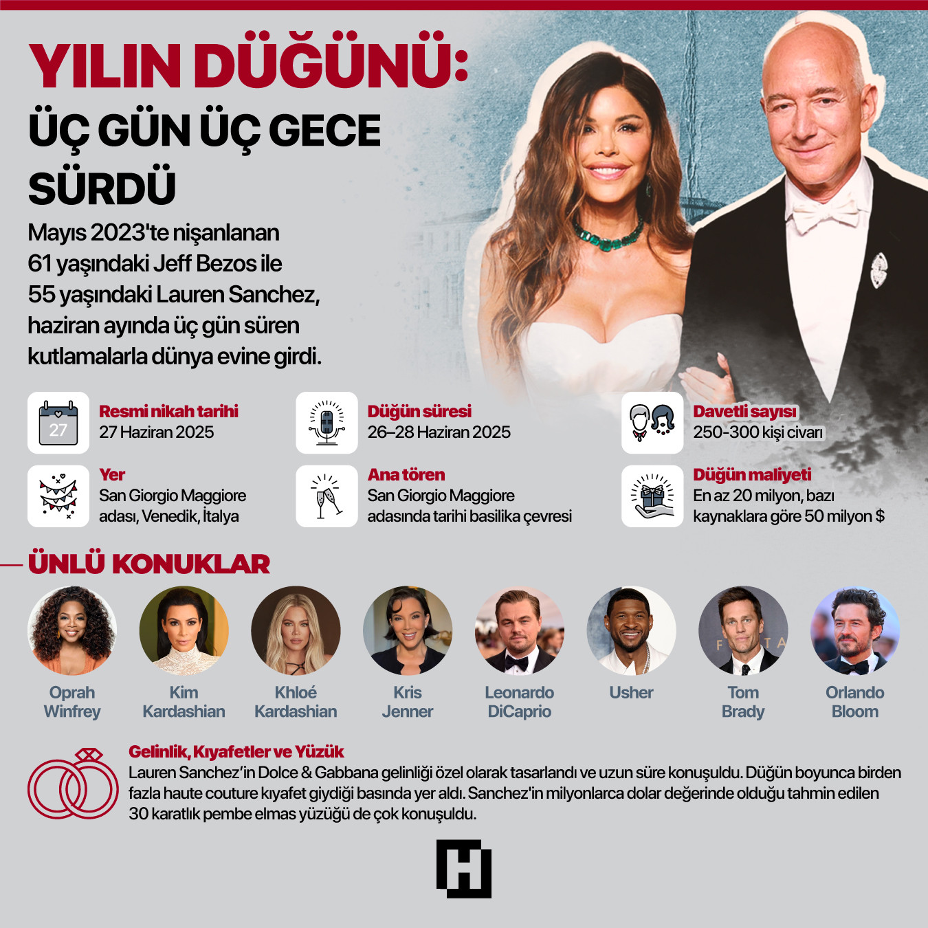 Hem pırıltısıyla hem de yağmur gibi yağan eleştirileriyle en çok konuşulan bu düğünün mutlu çifti, dünyanın en zengin insanlarından biri olan Jeff Bezos ile Lauren Sanchez. Çift, Venedik'teki San Giorgio Maggiore'de 27 Haziran'da hayatlarını resmen birleştirdi. Düğüne de spor, sanat, siyaset, müzik, hatta kraliyet dünyasından katılmayan kalmadı. Lauren Sanchez ile Jeff Bezos'un düğünü için 46 ile 56 milyon dolar arasında para harcandığı konuşuluyor. Bazıları bu düğünü bir masal gibi izlerken bazıları da çifti "gösteriş tutkunu" düğünü ise "görgüsüzlük" olarak nitelendirdi.
