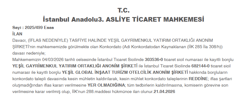 İstanbul Anadolu 3. Asliye Ticaret Mahkemesi’nde görülen davada, Yeşil Gayrimenkul Yatırım Ortaklığı A.Ş. ve Yeşil Global İnşaat Turizm Otelcilik A.Ş. hakkındaki incelemeler sonuçlandı. 21 Nisan 2026 tarihinde ilan edilen karara göre, şirketlerin sunduğu konkordato talepleri reddedilirken, yasal olarak iflaslarını gerektirecek bir durumun oluşmadığı tespit edildi.
