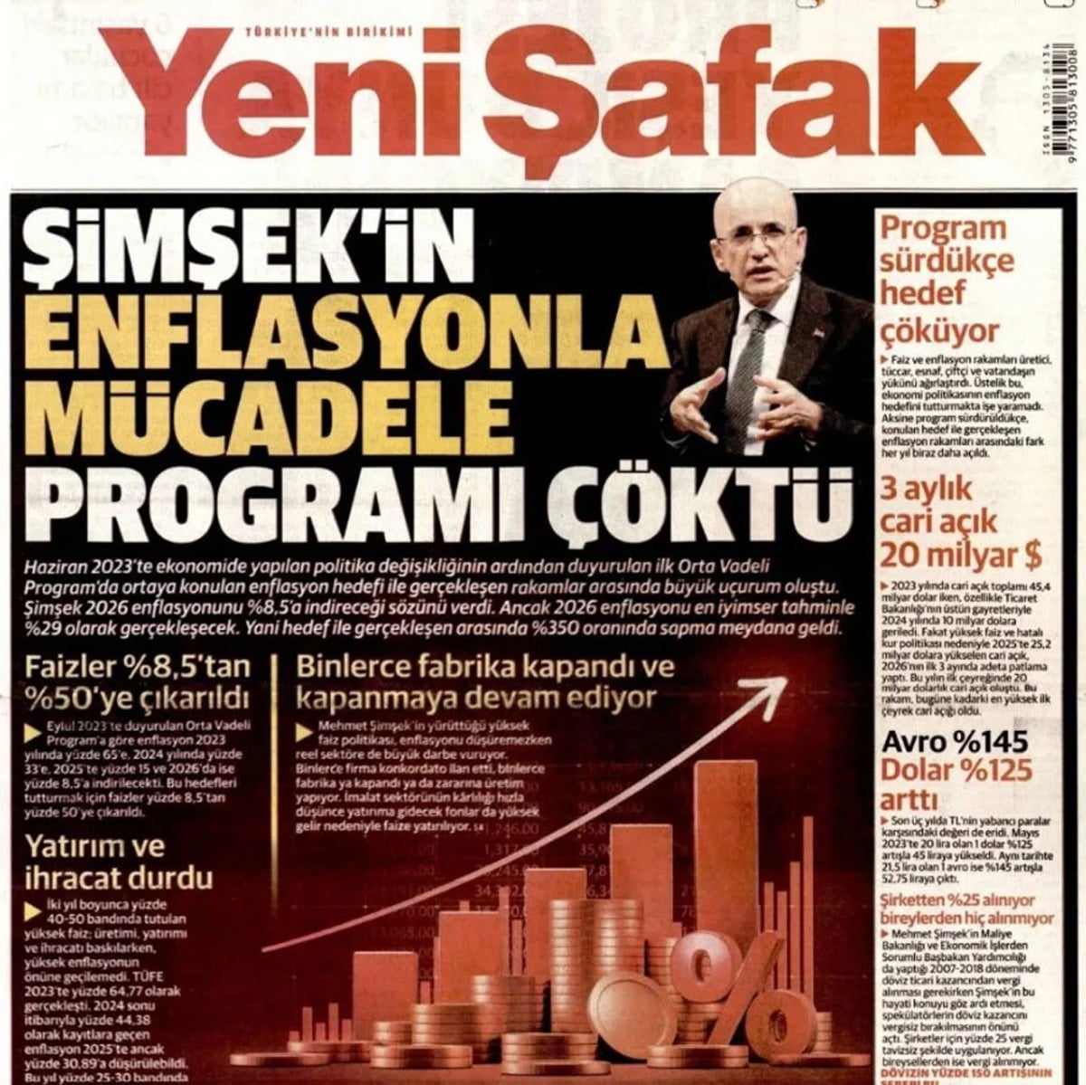 Yeni Şafak'ın dünkü manşetinde 2026 için açıkladığı yüzde 8.5’lik enflasyon hedefinin en iyimser tahminle yüzde 29 seviyesinde kalacağı belirtilerek, hedefle gerçekleşme arasında yüzde 350 oranında ‘büyük sapma’ olduğu yorumu yapıldı. Haberde, “Bu hedefleri tutturmak için faizler yüzde 8.5’ten yüzde 50’ye çıkarıldı. Bu rakamlar üretici, tüccar, esnaf, çiftçi ve vatandaşın faturasını ağır bir şekilde ödediği ekonomi politikasının enflasyon hedefini tutturmakta işe yaramadığını gösteriyor. Binlerce firma konkordato ilan etti binlerce fabrika ya kapandı ya da zararına üretim yapıyor” ifadeleri ile ekonominin içinde bulunduğu durum açıkça ortaya kondu.